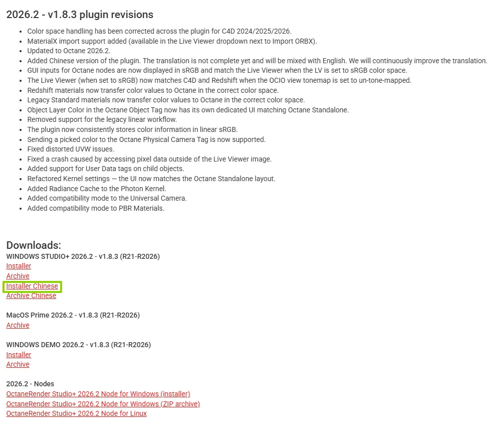 本次更新首次推出C4D版Octane中文插件,但官方明确说明翻译尚不完整,目前为“混合翻译”状态,未来将持续完善。从用户实际安装体验看: